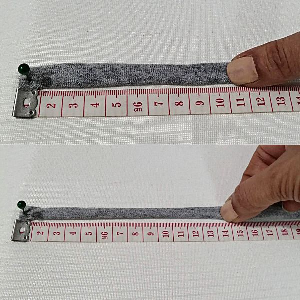 Para medir la elasticidad de nuestro trapillo, aseguramos la hebra y medimos 10cm, luego estiramos todo lo posible, en este caso llega a medir 13.5 cm, quiere decir que tiene de elasticidad 3.5 cm,